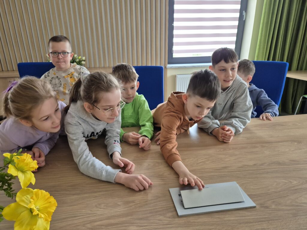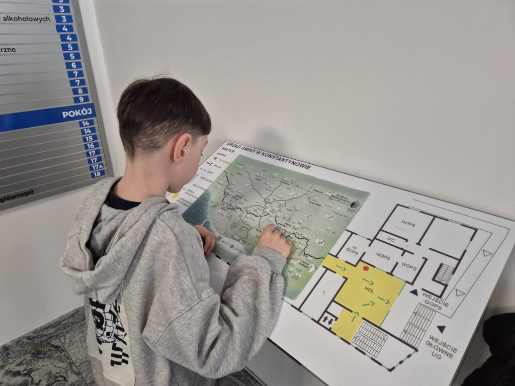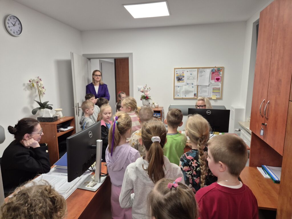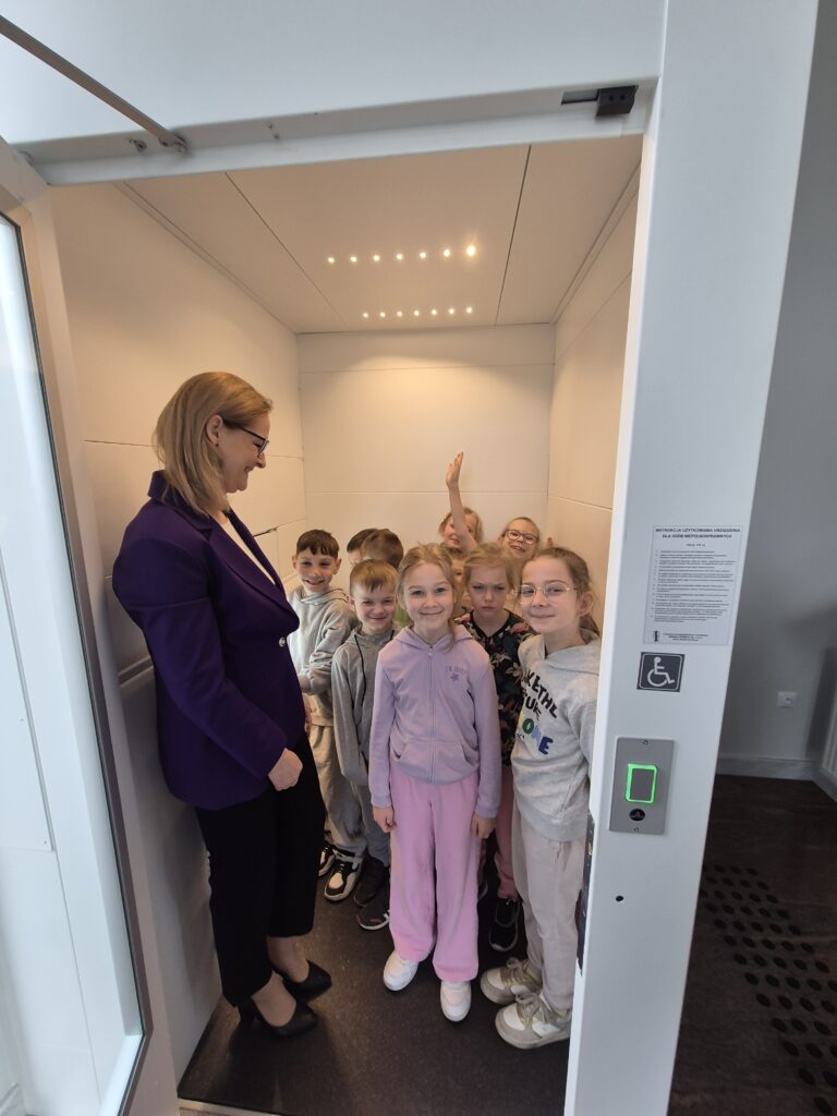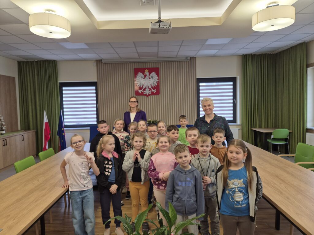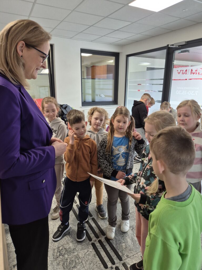 9-ego kwietnia br. uczniowie klasy 1a wraz z wychowawczynią p. Sabiną Dencikowską po raz drugi już spotkali się z jednym ze swoich Rodziców. Tym razem pierwszoklasiści udali się na zajęcia do Urzędu Gminy w Konstantynowie, gdzie powitała ich mama Stasia – p. Marta Jakubiuk, która pracuje jako starszy pracownik socjalny w Gminnym Ośrodku Pomocy Społecznej. Pani Marta przywitała uczniów klasy 1 a wraz z zastępczynią wójta Gminy Konstantynów- panią Katarzyną Melaniuk. Obydwie panie zaprosiły dzieci na bardzo zajmujący spacer po odremontowanym budynku gminy. Pierwszoklasiści poznali wielu pracowników gminy odpowiedzialnych za konkretne sektory działania gminy: księgowość, gospodarkę odpadami komunalnymi, budowę dróg, Urząd Stanu Cywilnego. Zastępczyni wójta gminy udostępniła również do zwiedzania gabinet pana wójta, który zrobił na dzieciach duże wrażenie. Jednak największe okrzyki zachwytu wywołała sala konferencyjna, w której odbywają się regularnie sesje rady gminy i wszystkie głosowania w sprawach dotyczących mieszkańców gminy. Uczniowie byli bardzo zainteresowani nowoczesnymi urządzeniami, w które została wyposażona sala obrad. Bardzo wnikliwie dopytywali o dostosowanie budynku gminy na potrzeby osób z niepełnosprawnością. Byli ogromnie zaskoczeni nowoczesną windą, która umożliwia osobom niepełnosprawnym swobodne poruszanie się po budynku. Wnikliwi pierwszoklasiści zauważyli nawet dostosowania dla osób niewidomych na każdych drzwiach pokoju, oznajmujące osobom niewidomym w alfabecie Braille’a, z jaką sprawą można się tutaj zgłosić. Na koniec spotkania dzieci miały możliwość skorzystania z windy dla osób z niepełnosprawnością, co wywołało wśród nich ogromny entuzjazm. Tosia i Filip w imieniu wszystkich pierwszoklasistów i wychowawczyni podziękowali pani Katarzynie Melaniuk i pani Marcie za poświęcony czas wręczając skromne podziękowanie. Pani zastępczyni wójta również wyraziła wdzięczność za to, bardzo dla niej inspirujące spotkanie i podziękowała pierwszoklasistom za ich otwartość i bezpośredniość różnymi materiałami dotyczącymi Gminy Konstantynów.