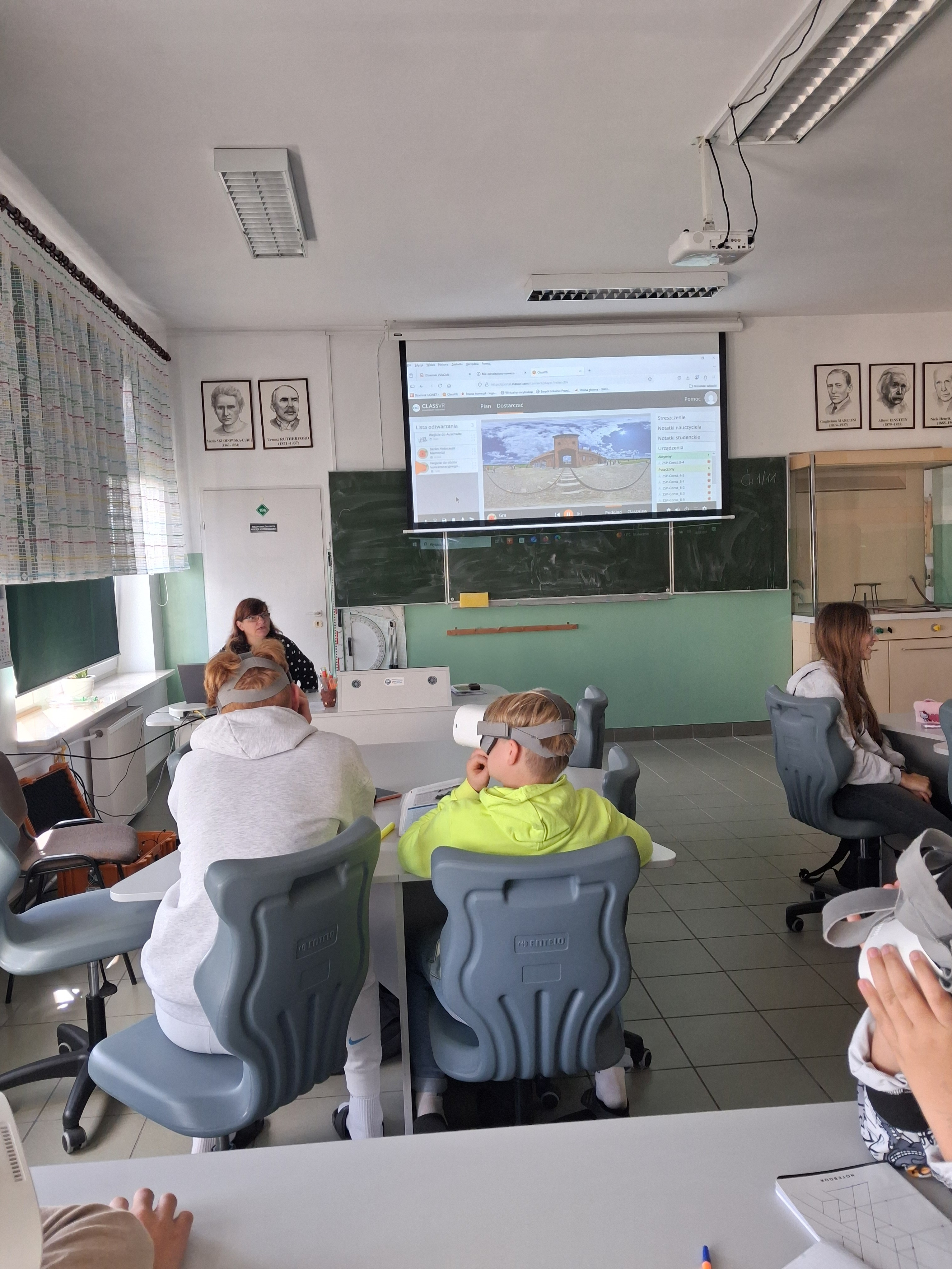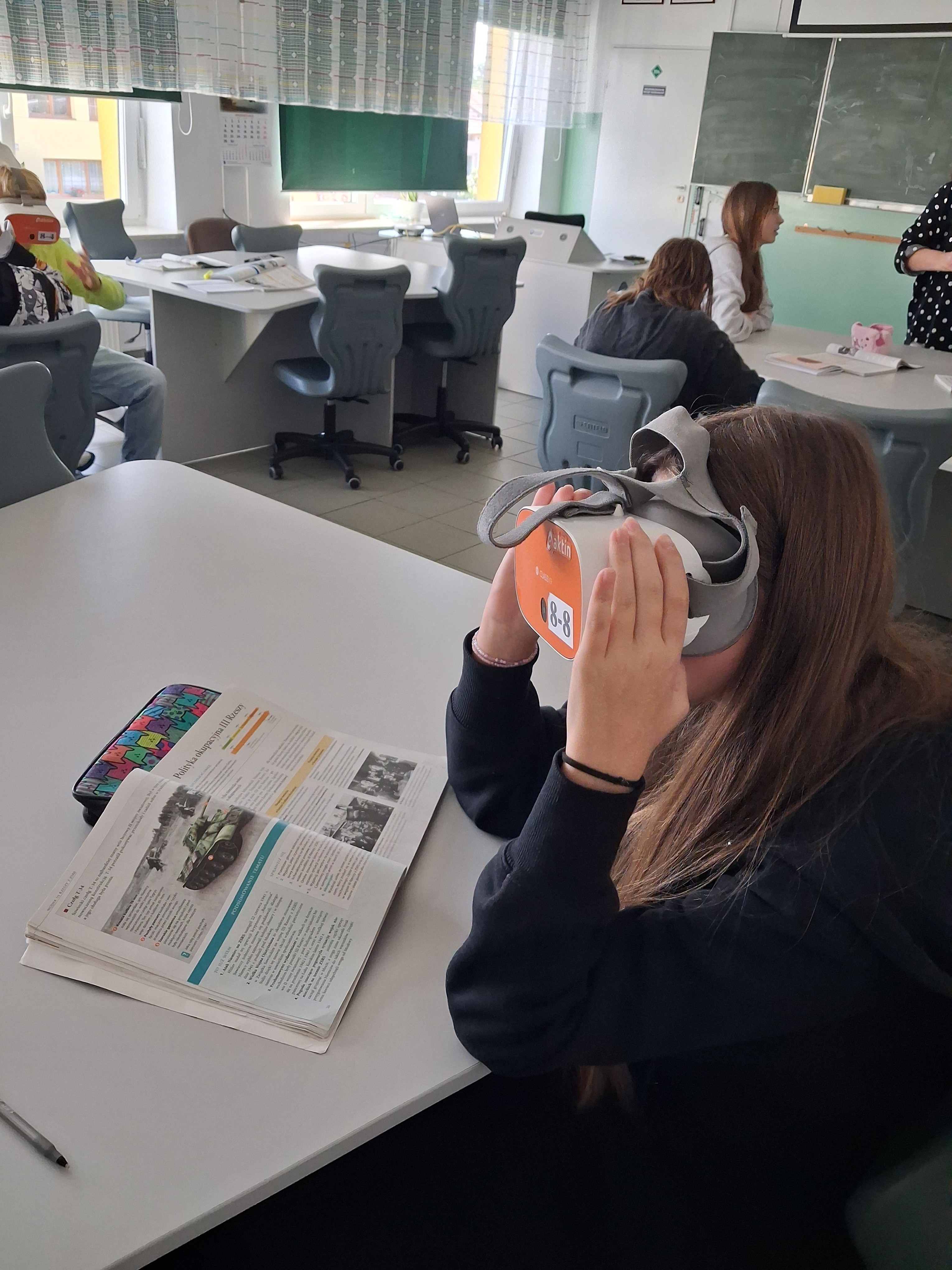 Na lekcji historii omawiano „Politykę okupacyjną III Rzeszy”, zwiedzając wirtualnie teren obozu Auschwitz. Wirtualne rekonstrukcje i lekcje z wykorzystaniem okularów VR, to nowoczesne metody pracy z uczniami ułatwiające rozumienie wydarzeń historycznych.