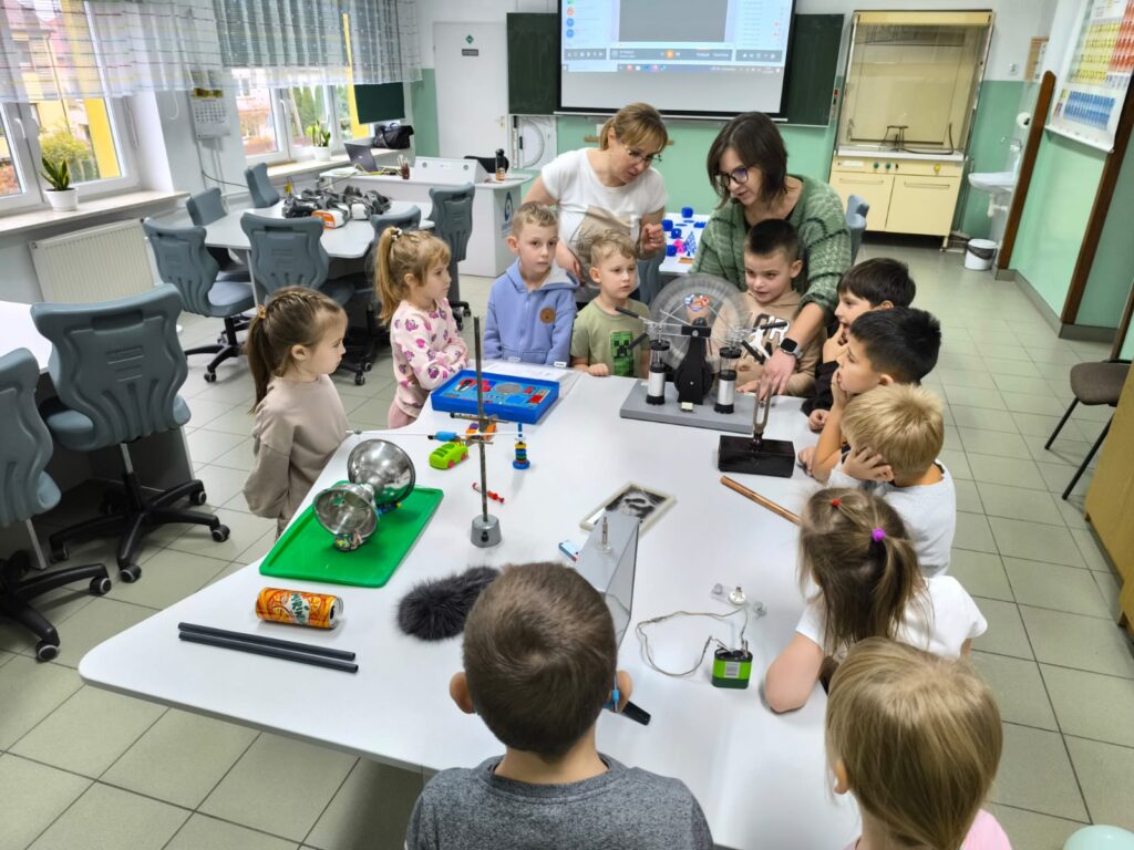 Zanim rozpoczęła się część praktyczna, uczestnicy poznali zasady bezpiecznego korzystania z pracowni „Laboratoria Przyszłości”. Następnie przenieśli się do świata nauki podczas niecodziennej lekcji fizyki. Dzieci mogły samodzielnie przeprowadzać eksperymenty z zakresu elektrostatyki i magnetyzmu, korzystając z pomocy dydaktycznych dostępnych w szkolnym laboratorium. Najwięcej emocji wzbudziła maszyna elektrostatyczna – możliwość wytworzenia własnego „pioruna” zrobiła ogromne wrażenie!