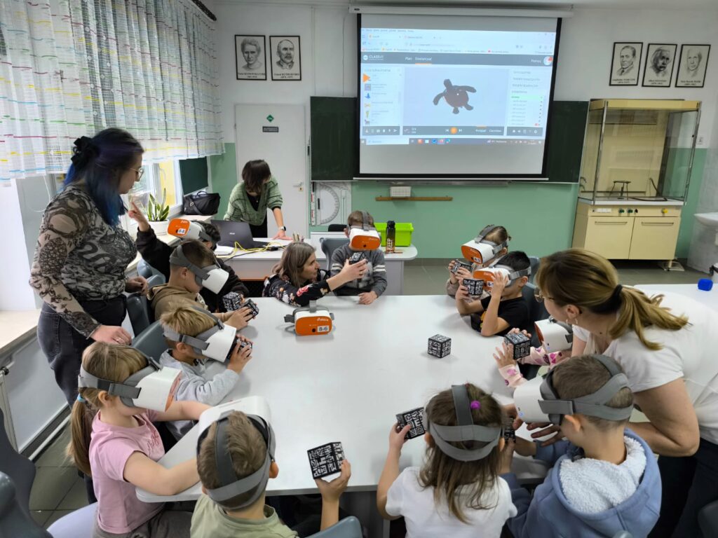 Prawdziwą atrakcją zajęć była jednak podróż w wirtualny świat. Dzięki okularom VR i platformie Class VR przedszkolaki mogły oglądać Ziemię z lotu ptaka, a następnie zanurzyć się w głębinach oceanu w towarzystwie żółwi i lwów morskich. Interaktywne kostki 3D pozwoliły im obejrzeć motyla, słonia, wieloryba z zupełnie nowej perspektywy – takiej, jakiej nie dają żadne książkowe ilustracje.
