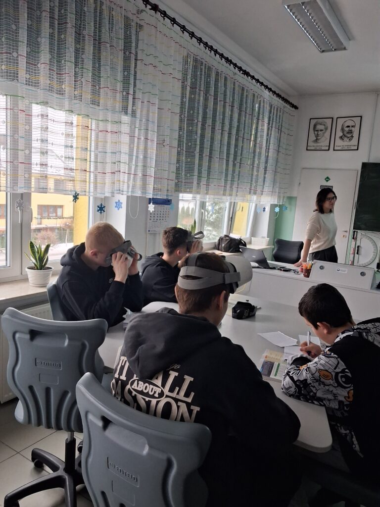 Na lekcji historii omawiano „Politykę okupacyjną III Rzeszy”, zwiedzając wirtualnie teren obozu Auschwitz. Wirtualne rekonstrukcje i lekcje z wykorzystaniem okularów VR, to nowoczesne metody pracy z uczniami ułatwiające rozumienie wydarzeń historycznych.