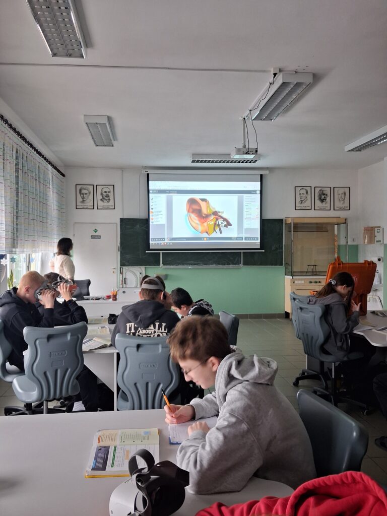 W czasie lekcji biologii pogłębiano wiedzę z zakresu budowy i funkcji krwi. Za pomocą okularów VR oglądano obrazy 3D krwinek białych, czerwonych oraz przepływ krwi w żyle.