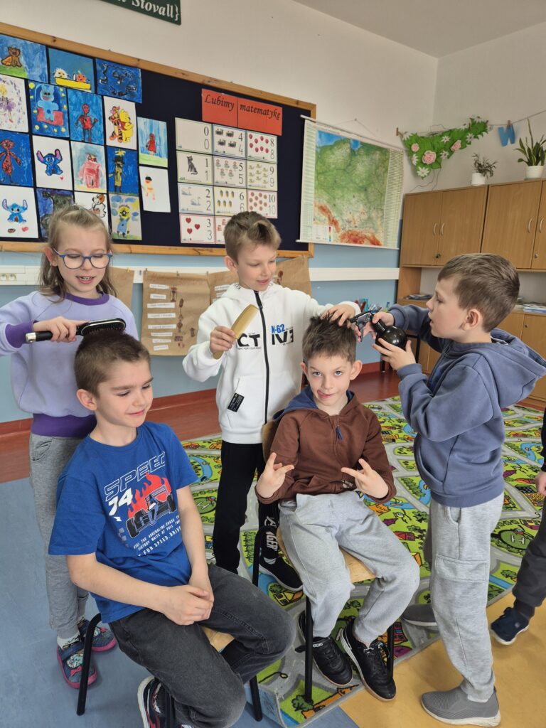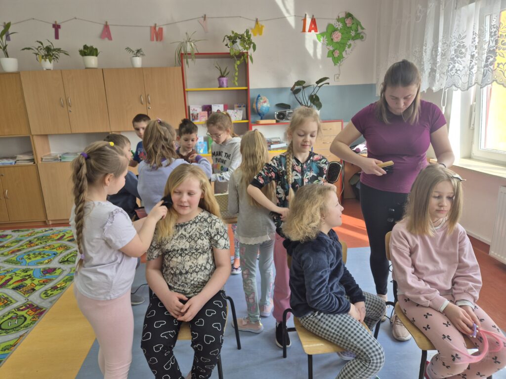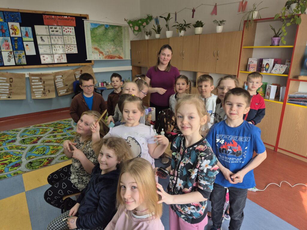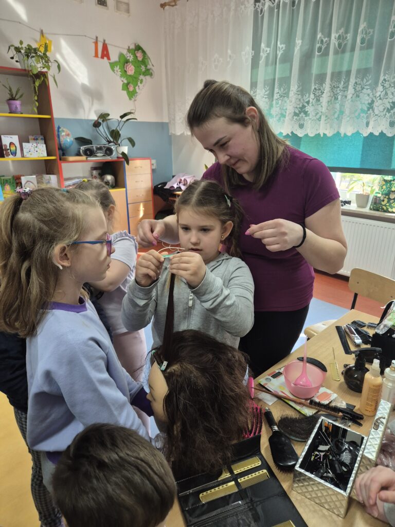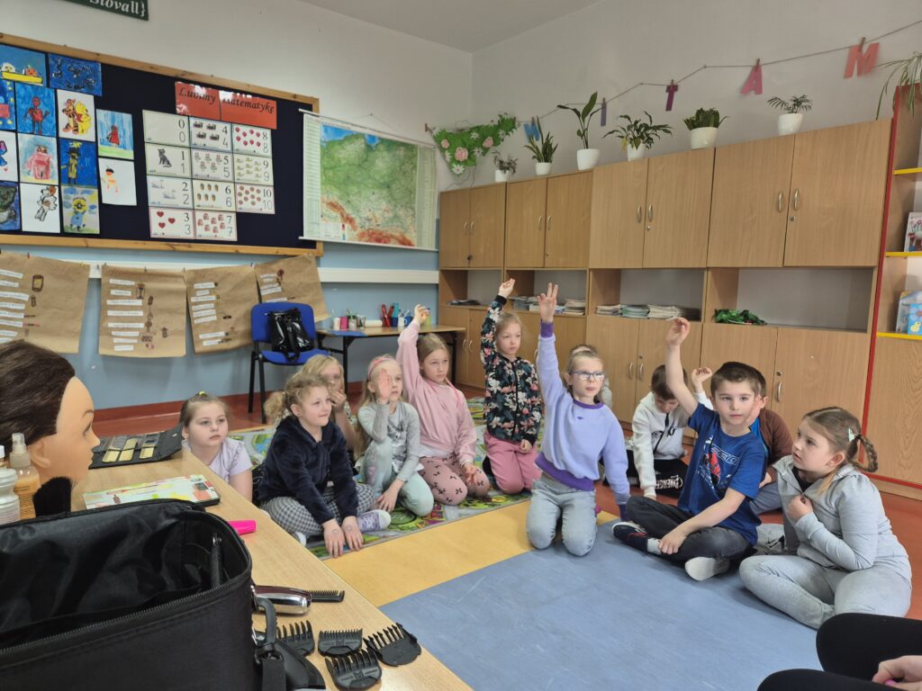 Uczniowie klasy 1 a wraz z wychowawczynią p. Sabiną Dencikowską zaproponowali już przed feriami zimowymi swoim Rodzicom pomysł prezentowania swoich profesji na forum klasy. Rodzice pierwszoklasistów z ogromną ochotą przyjęli taką inicjatywę i zaoferowali swój czas. I tak, 25 marca br. uczniowie przywitali w swojej sali pierwszą mamę – panią Ewelinę Miturę, która na co dzień prowadzi własny zakład fryzjerski, a także jest fryzjerką mobilną. Mama Ali przeprowadziła z dziećmi wstępną pogadankę nt. obowiązków fryzjera i kryteriów, jakie musi spełnić kandydat na mistrza fryzjerstwa. Pierwszoklasiści byli ciekawi każdego aspektu pracy fryzjera: przyrządów fryzjerskich, wyposażenia zakładu fryzjerskiego, umiejętności, które powinien posiadać dobry fryzjer. Pani Ewelina cierpliwie odpowiadała na każde pytanie, po czym zaproponowała dzieciom udział w krótkich warsztatach fryzjerskich. Największą frajdę sprawiło pierwszoklasistom, szczególnie chłopcom, kręcenie wałków do trwałej ondulacji. Zadanie okazało się wcale nie takie banalne, na jakie wygląda, jednak dzieci wykazały się ogromną cierpliwością i dokładnością. Przy okazji nie obeszło się bez sympatycznych wybuchów śmiechu na widok nowych fryzur kolegów. W podziękowaniu za bardzo zajmujące warsztaty pani Ewelina otrzymała owacje na stojąco od uczestników, a uczniowie za swój „trud fryzjerski” zostali nagrodzeni przez mamę Ali słodkim upominkiem. Dziękujemy serdecznie za poświęcony czas pani Ewelinie i już nie możemy doczekać się kolejnego spotkania z Rodzicem.
