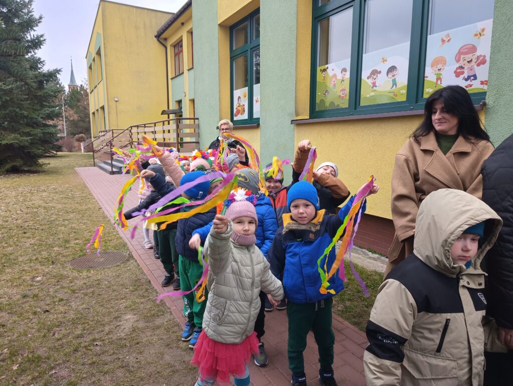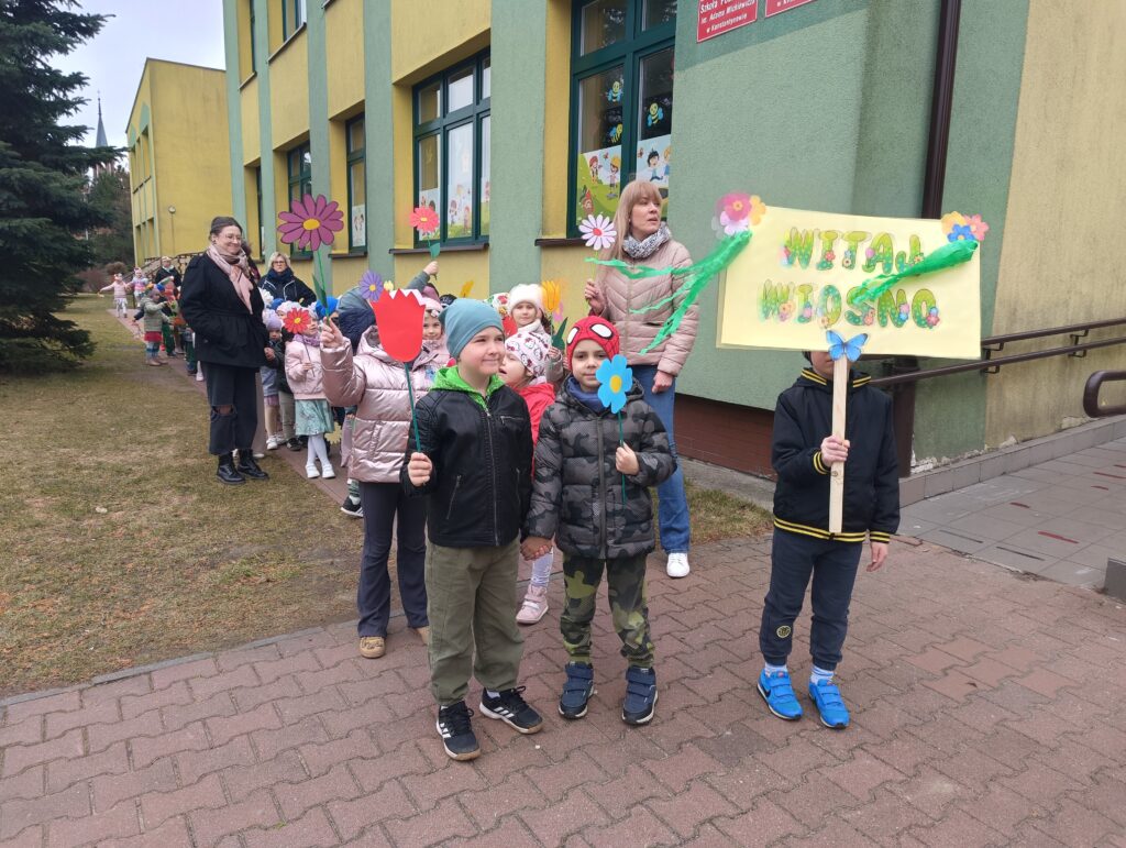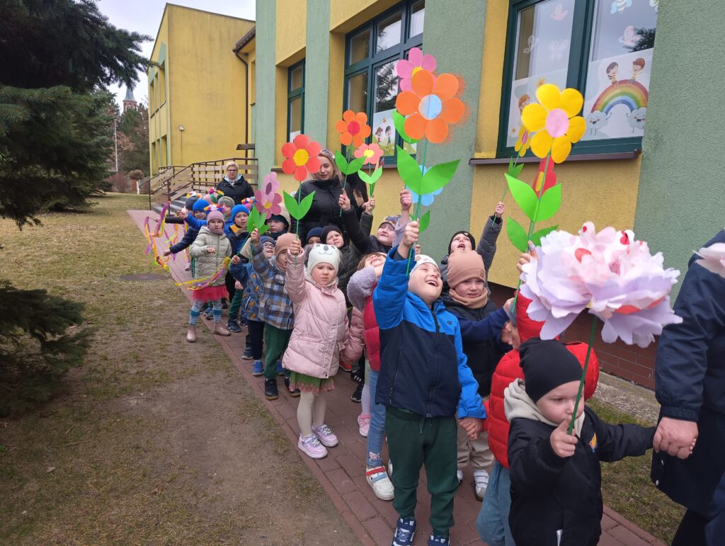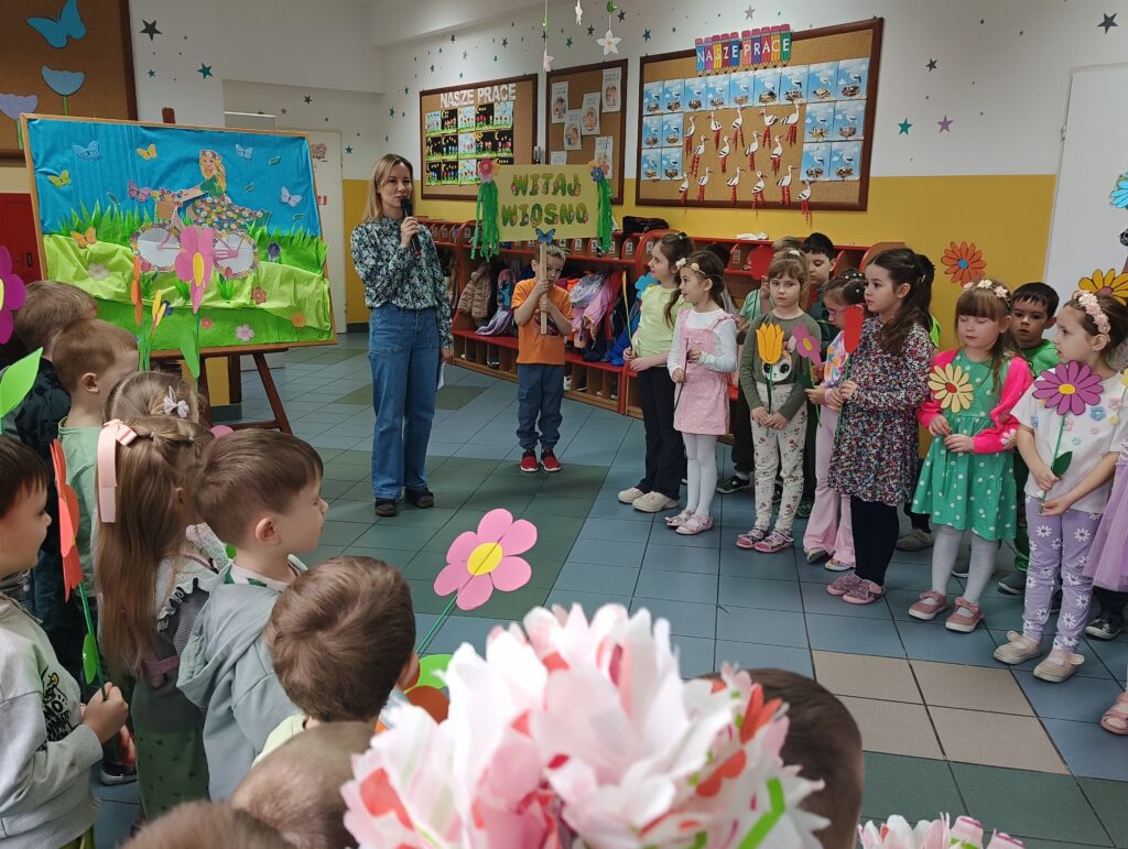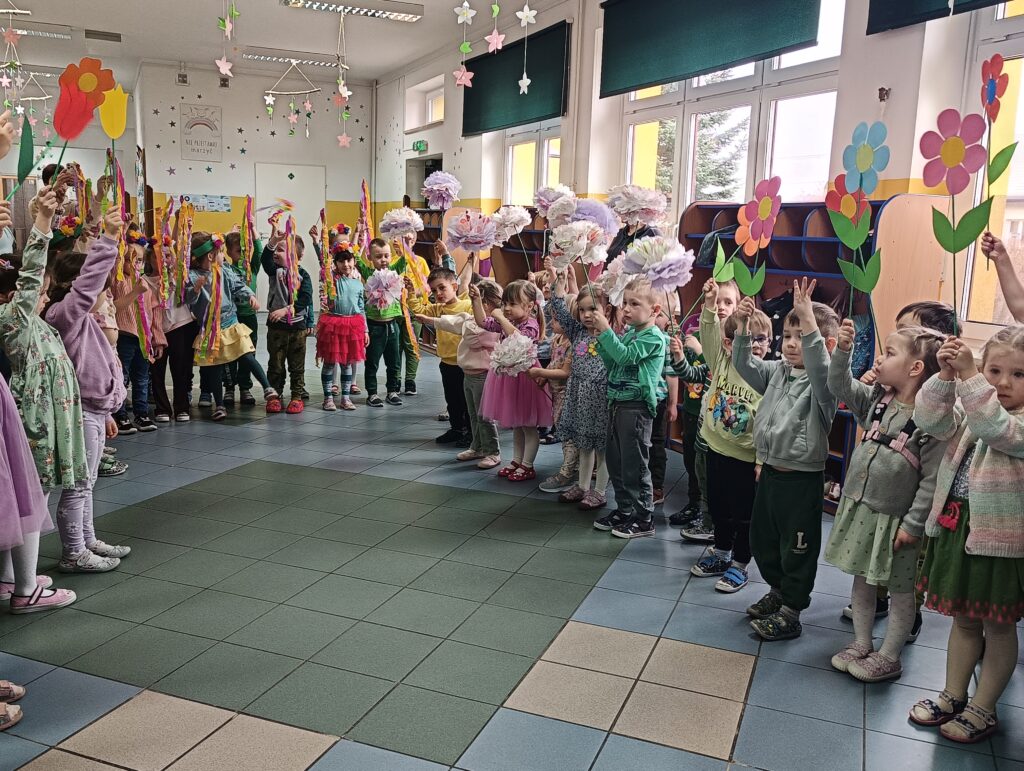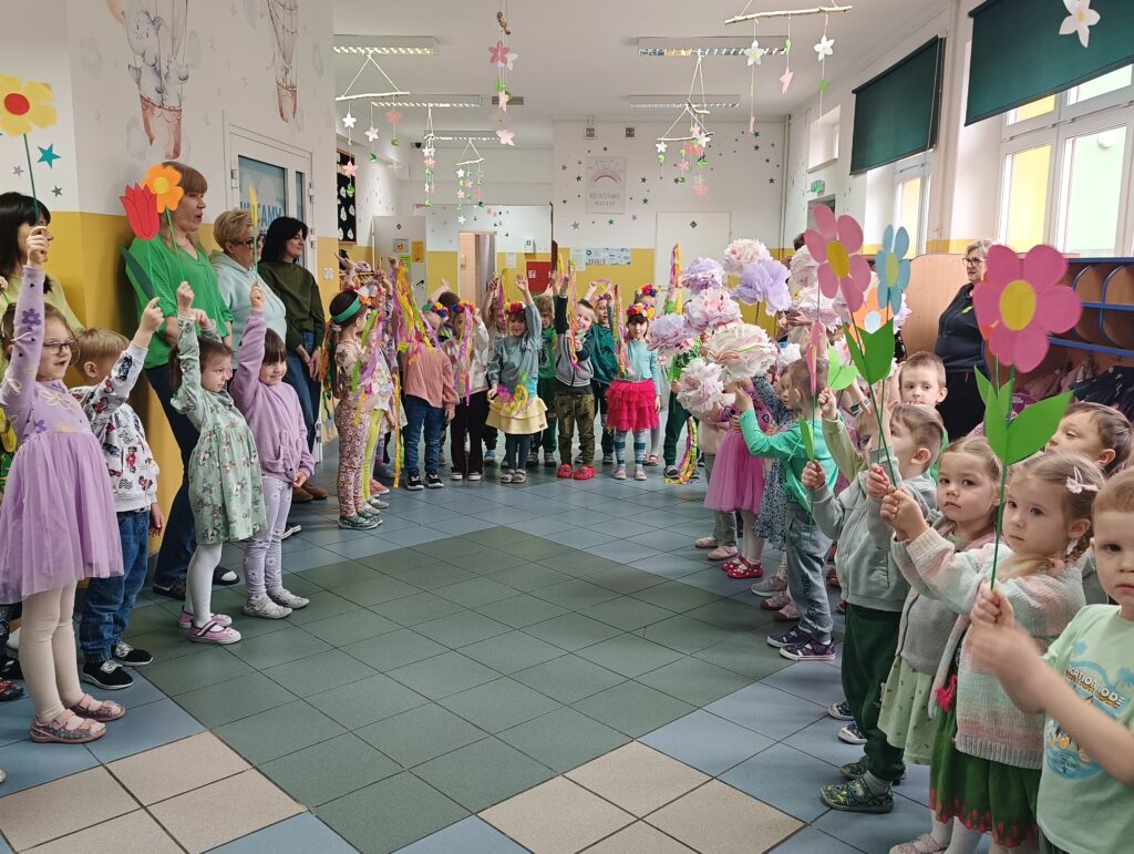 Powitanie wiosny w przedszkolu to świetna okazja do zabawy, ruchu i kreatywności. Dnia 20 marca wszystkie grupy spotkały się na korytarzu aby powitać nową porę roku. Zielone stroje, kwiaty w ręku, kolorowe bibułki i opaski na głowach sprawiły, ze poczuliśmy się jak na wiosennej łące. W trakcie wydarzenia nie zabrakło elementów edukacyjnych – dzieci rozmawiały o zmianach zachodzących w przyrodzie, odgadywały zagadki, rozpoznawały, które wypowiedzi dotyczące wiosny są prawdziwe, a które fałszywe. Przedszkolaki zaprezentowały wiersze i piosenki o tematyce wiosennej, wprowadzając wszystkich w radosny nastrój. Następnie dzieci wzięły udział w kolorowym, wiosennym pochodzie po najbliższej okolicy szukając oznak wiosny.