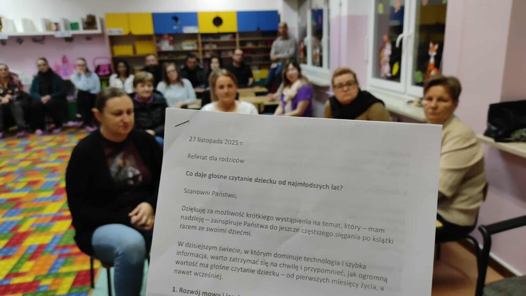 26 listopada 2025 r. w naszym przedszkolu odbyło się niezwykle wartościowe spotkanie dla rodziców, poświęcone tematowi „Co daje głośne czytanie dziecku od najmłodszych lat?”. Wydarzenie zostało zorganizowane w ramach realizacji Narodowego Programu Rozwoju Czytelnictwa 2.0. na lata 2021-2025 – Priorytet 3., którego celem jest wspieranie rozwoju kompetencji czytelniczych dzieci i młodzieży oraz kształtowanie nawyku codziennego obcowania z książką.