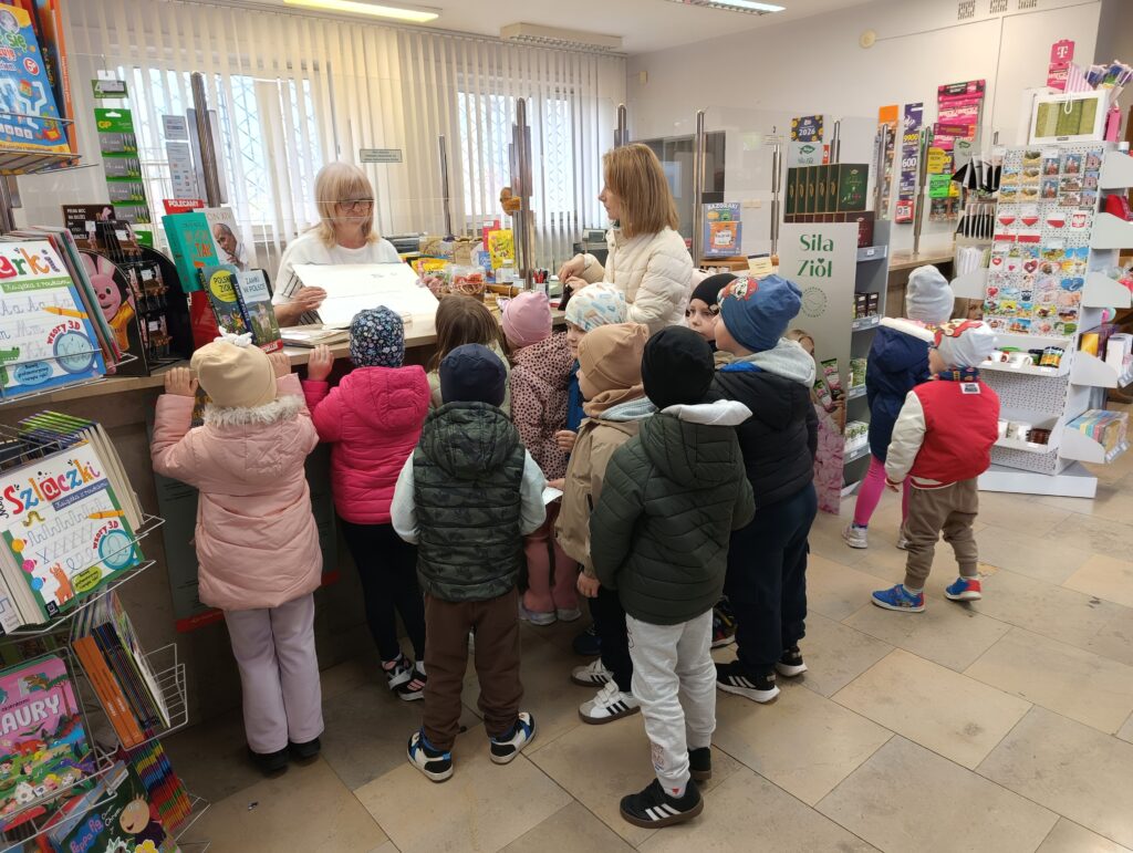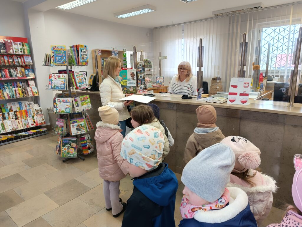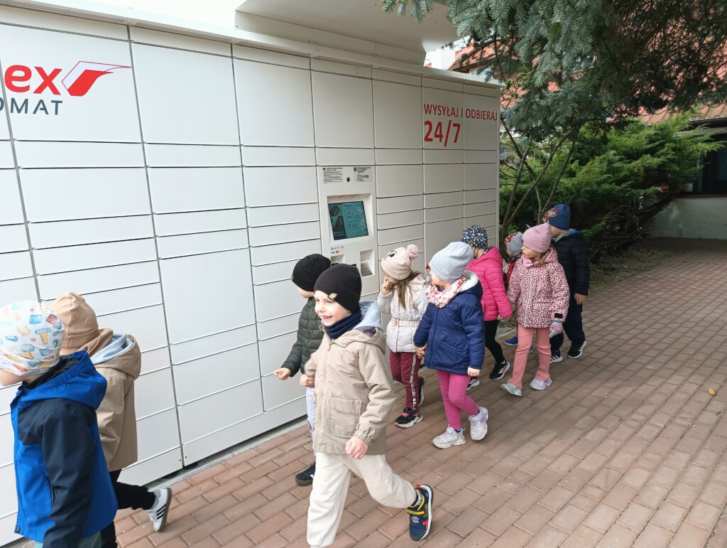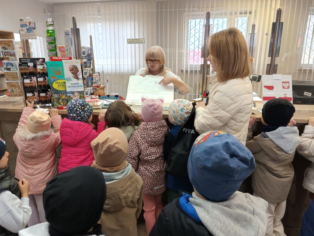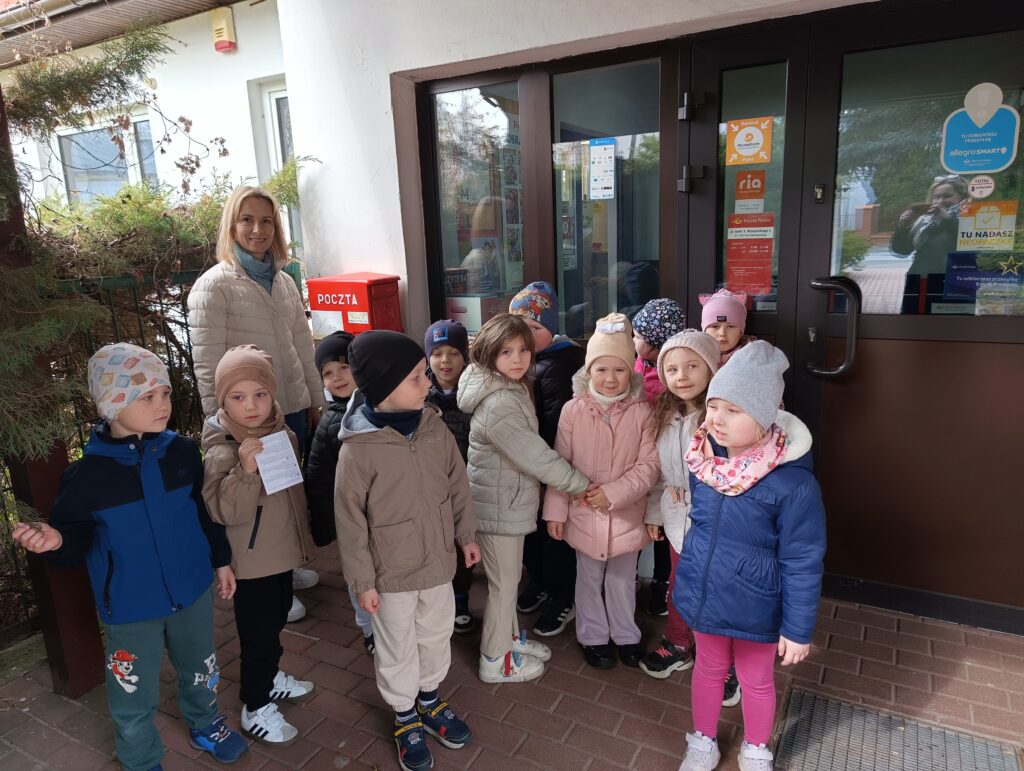 Dnia 14 kwietnia przedszkolaki z grupy Jagódki wybrała się na pocztę. Celem wycieczki było zapoznanie z instytucją poczty oraz pracą urzędnika pocztowego, a także wysłanie listu z pracami plastycznymi na konkurs. Dzieci dowiedziały się czym jest poczta i jakie usługi świadczy: wysyłanie listów, paczek, opłacanie rachunków, sprzedaż prasy i książek. Pani urzędnik opowiedziała jaka jest droga listu od nadawcy do odbiorcy oraz co trzeba zrobić, aby list dotarł do adresata. Przedszkolaki zobaczyły jak wygląda godło poczty polskiej oraz prawdziwa skrzynka pocztowa. Wizyta była również dobrą okazją do utrwalenia zasad kulturalnego zachowania się w miejscu publicznym.